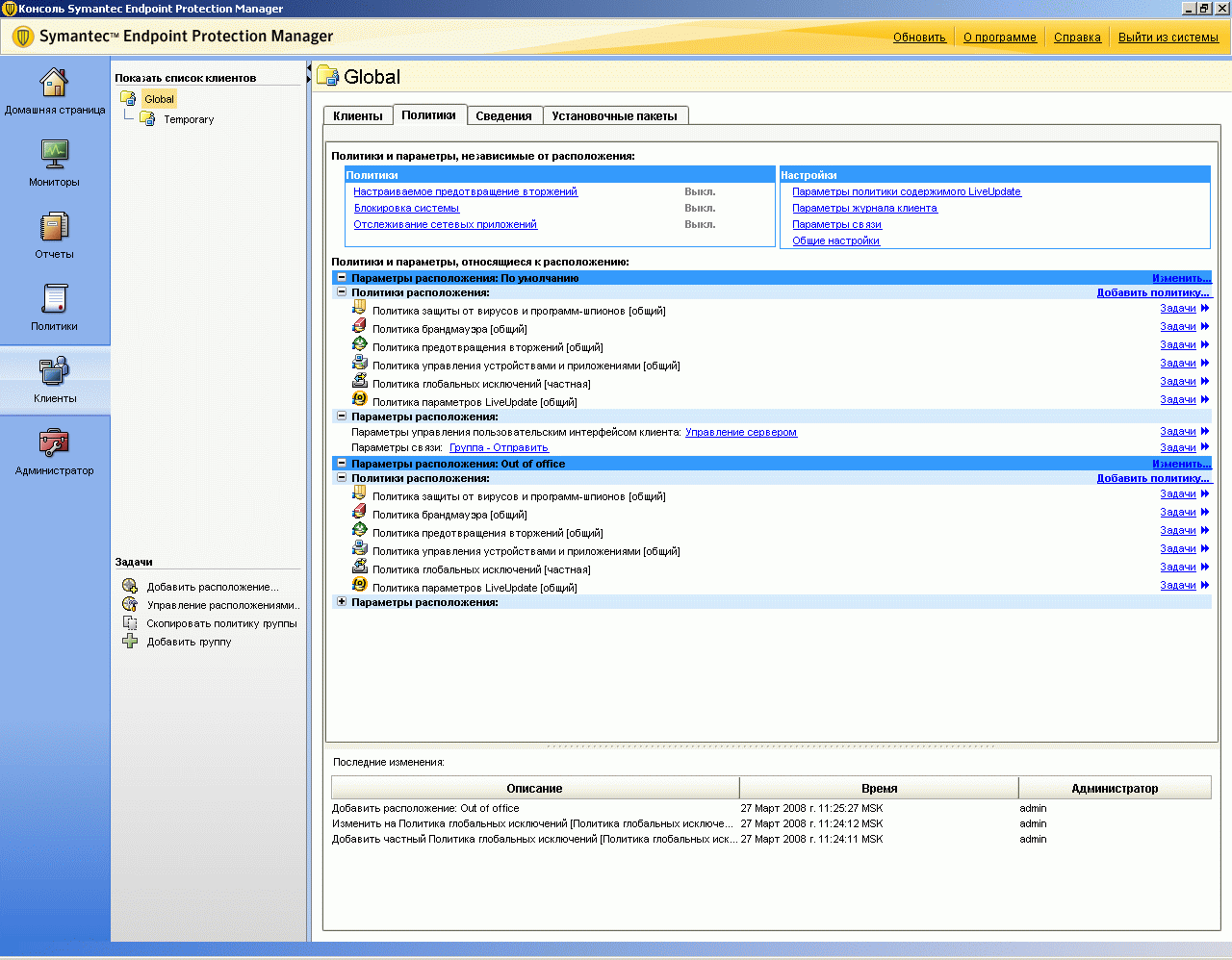 Рисунок 2.20: Endpoint Protection Manager Console – Clients – Policies – В зависимости от выбранных групп появляется возможность использования либо общих, либо локальных политик безопасности; можно использовать как политики, созданные в разделе Policies (см. Рисунок 2.7 - 2.15), так и локально создаваемые в данном разделе. Политики могут наследоваться от вышестоящей группы или быть изолированными, политики могут быть общие вне зависимости от места нахождения клиентского модуля, либо в зависимости от этого меняться. Также существуют политики, общие для любого расположения и поэтому настраиваемые только в данном интерфейсе