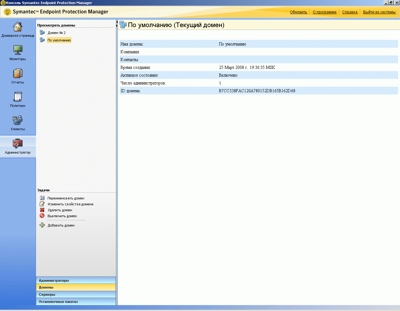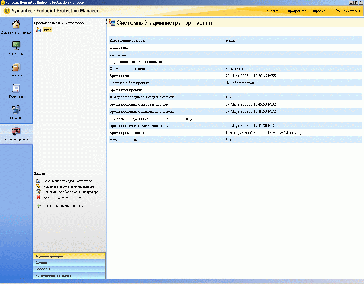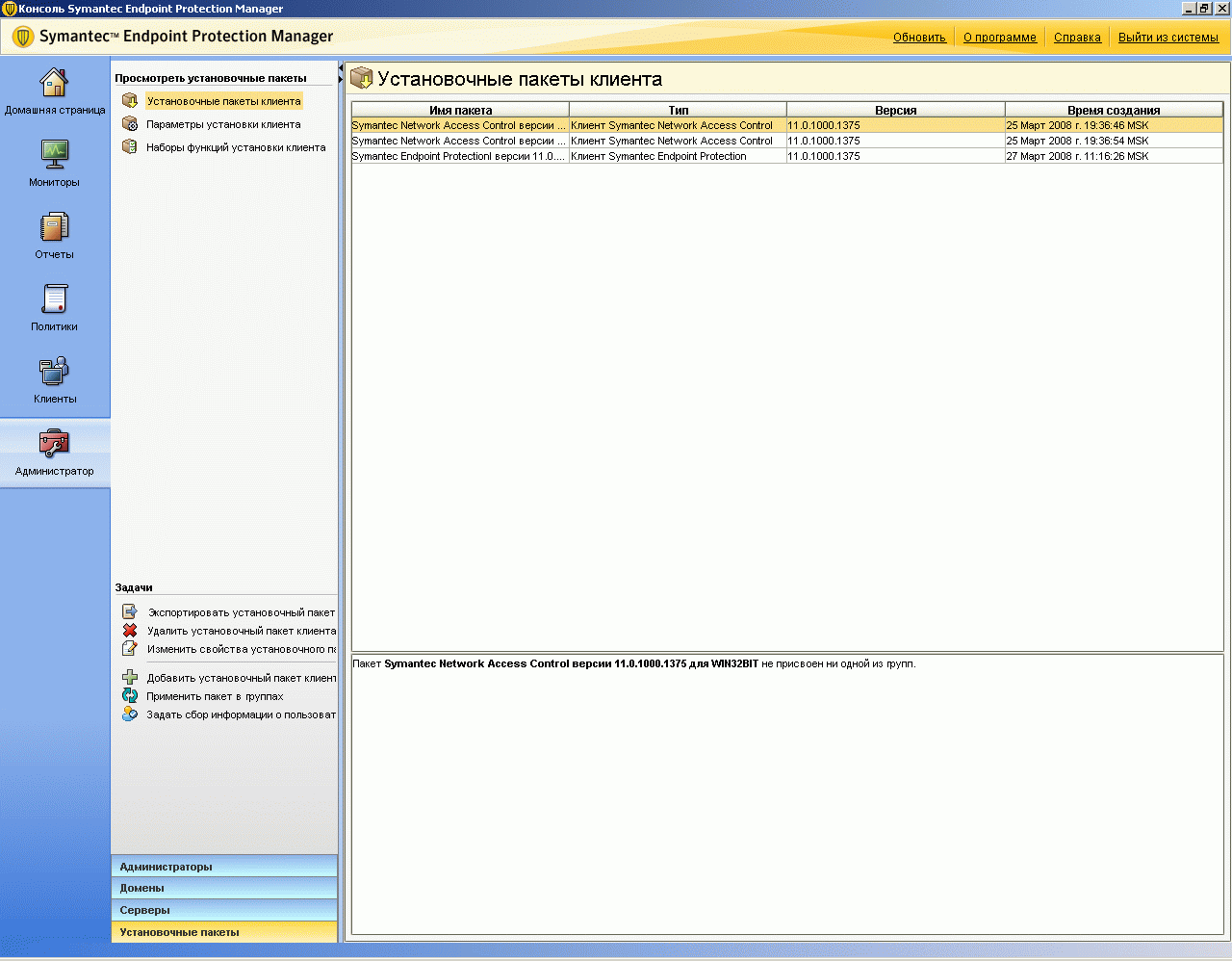 Рисунок 2.24: Endpoint Protection Manager Console – Clients – Install Packages – Add Client Install Package – Данный раздел позволяет создавать для каждой группы набор пакетов инсталляции или пакетов обновлений с включением требуемых функций и определенных версий, в том числе возможна поддержка пакетов разной языковой локализации на одном сервереРисунок 2.25: Endpoint Protection Manager Console – Admin – Administrator – Сводная панель основных администраторских настроек системы: доступ, домены, основные и второстепенные сервера управления, клиентские пакеты