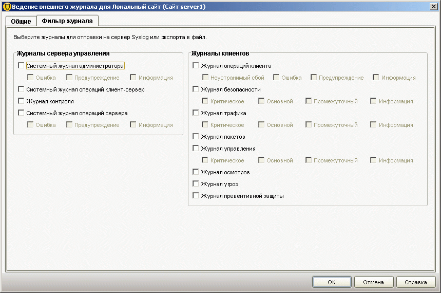 Рисунок 2.28e: Endpoint Protection Manager Console – Admin – Servers – External Logging – Администратору также представлена возможность настройки репликаций системных логов и логов безопасности в режиме реального времени в другие системы