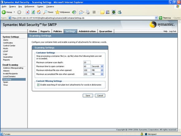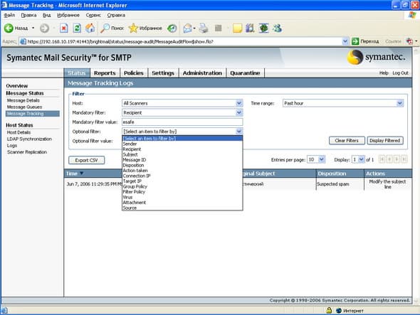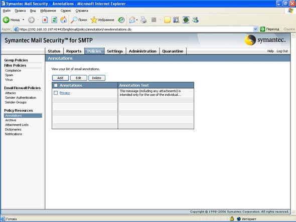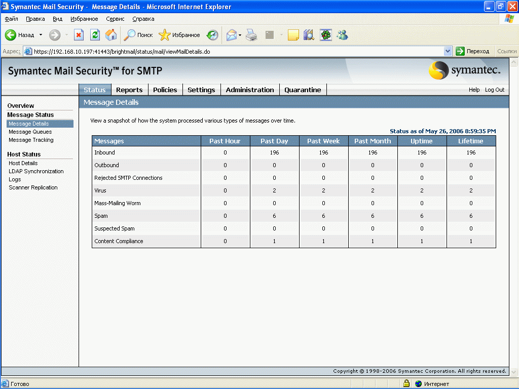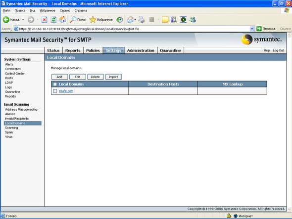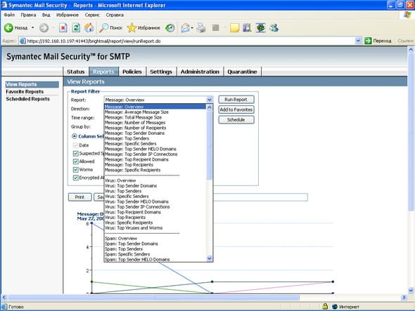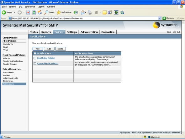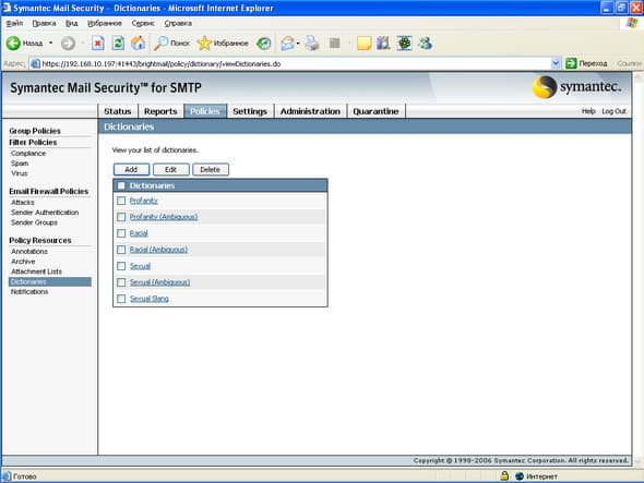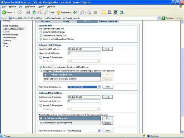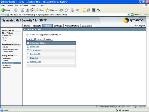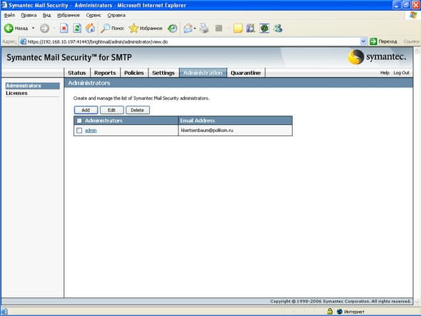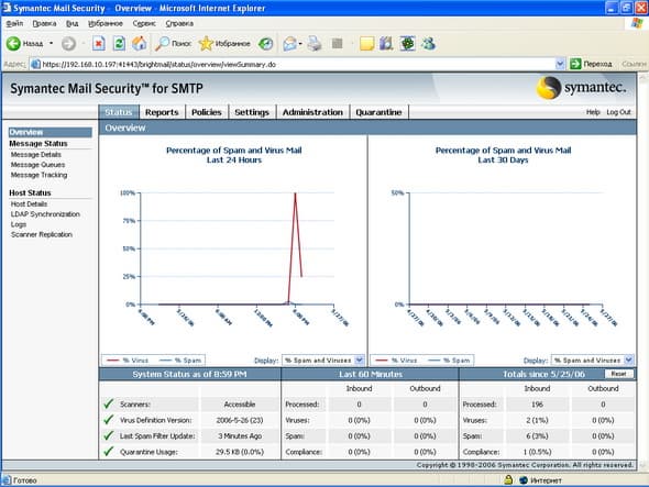 Продукт Symantec Mail Security for SMTP позволяет компаниям любого размера легко решить проблему защиту почтового шлюза от вирусов и нежелательной почты. Поддержка разнородных платформ (Windows, Linux, Unix) позволяет легко приспособить и масштабировать данное решение для любой ИТ-инфраструктуры, обеспечивая при этом удобный и легкий способ мониторинга приема и передачи сообщений электронной почты, а также контроля содержимого и вложений для эффективного функционирования почтовой системы. Графический интерфейс управления, доступный из любой точки корпоративной сети, позволяет администратору почтовой системы легко и просто отслеживать прохождение и обработку любого количества электронных сообщений.