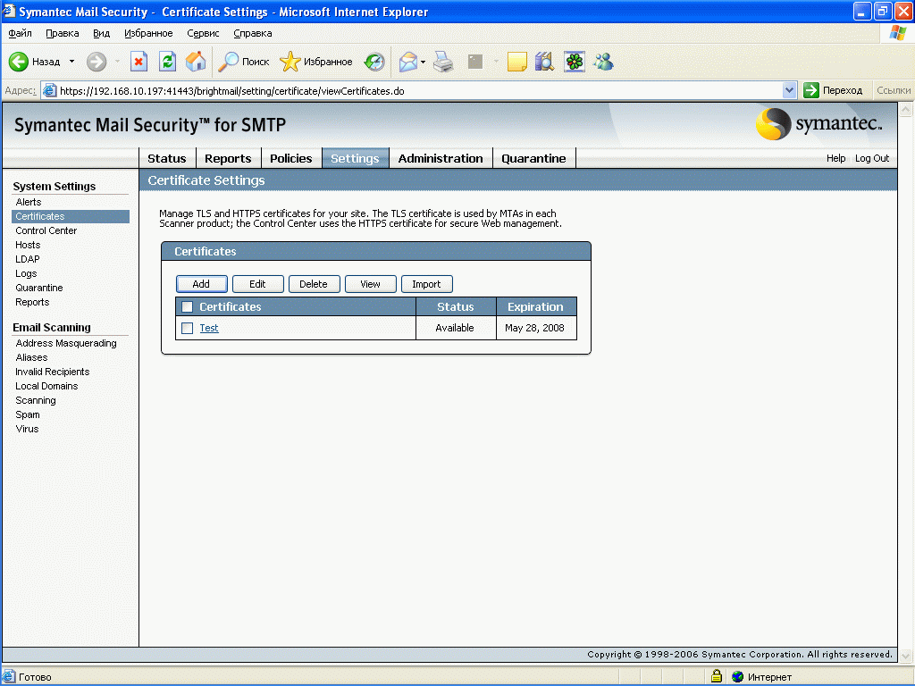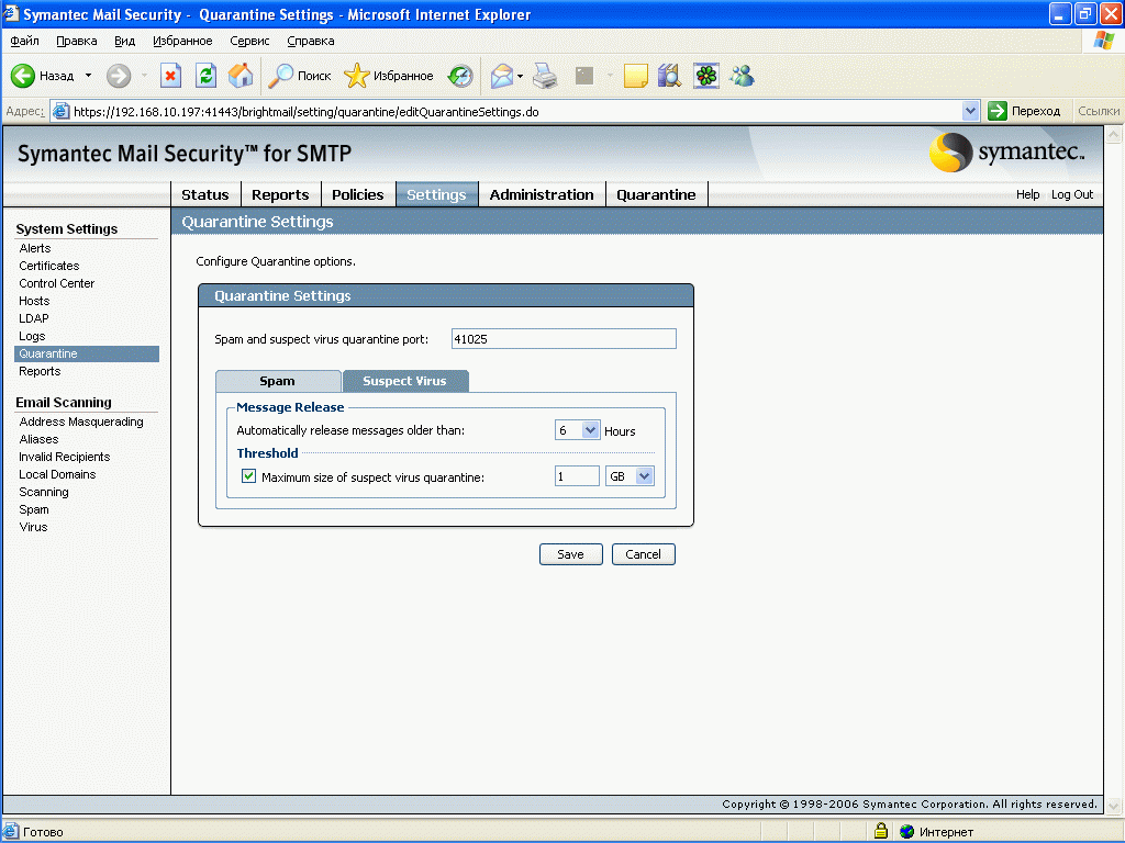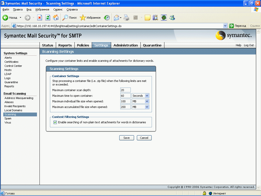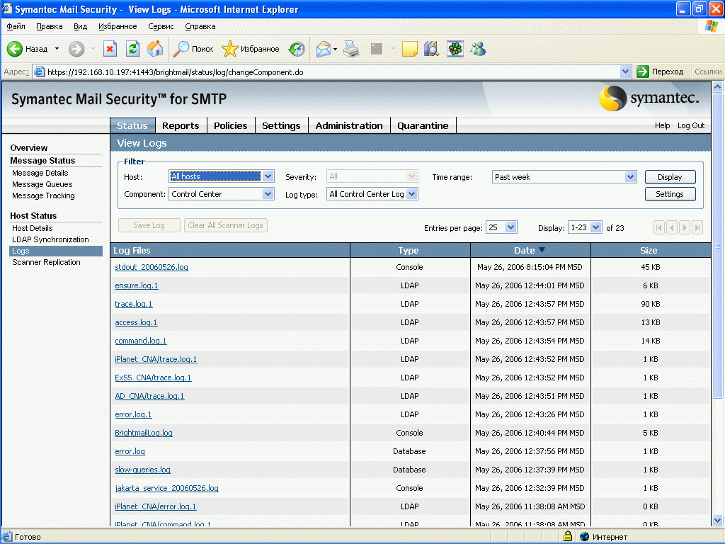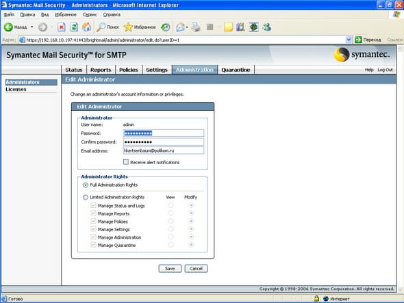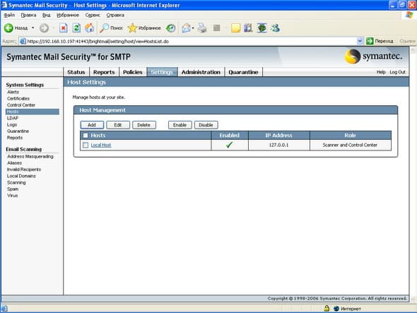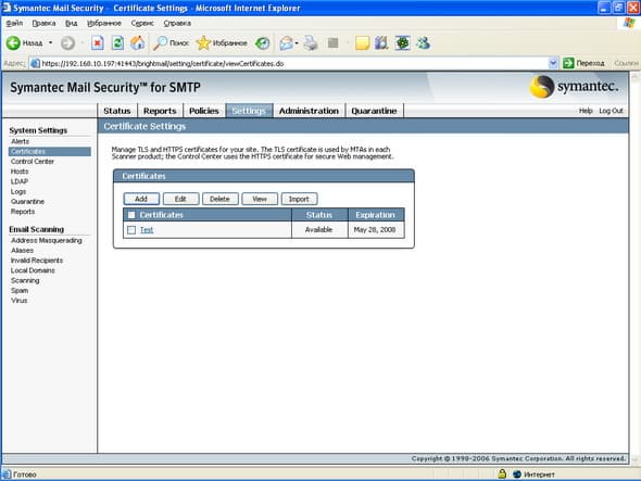 Продукт Symantec Mail Security for SMTP позволяет компаниям любого размера легко решить проблему защиту почтового шлюза от вирусов и нежелательной почты. Поддержка разнородных платформ (Windows, Linux, Unix) позволяет легко приспособить и масштабировать данное решение для любой ИТ-инфраструктуры, обеспечивая при этом удобный и легкий способ мониторинга приема и передачи сообщений электронной почты, а также контроля содержимого и вложений для эффективного функционирования почтовой системы. Графический интерфейс управления, доступный из любой точки корпоративной сети, позволяет администратору почтовой системы легко и просто отслеживать прохождение и обработку любого количества электронных сообщений.