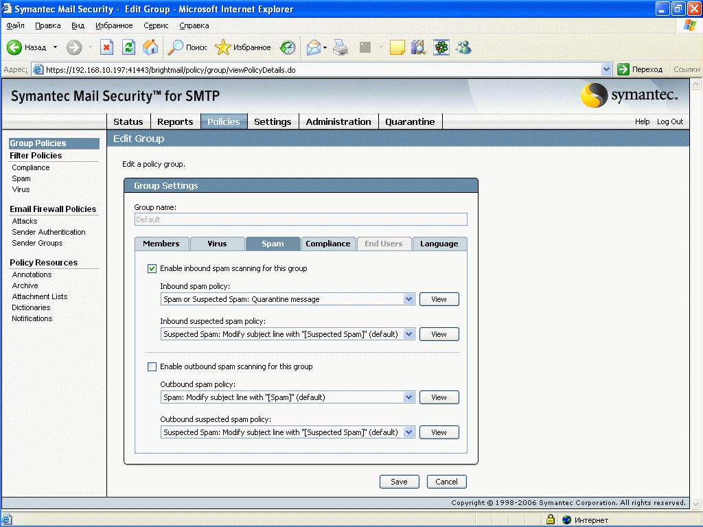 Рисунок 13: Policies – Group Policies – Spam – Настройка правил обработки спам инцидентов для входящей и исходящей почты, набор правил можно определять самостоятельно (см. Рисунок 19-20)