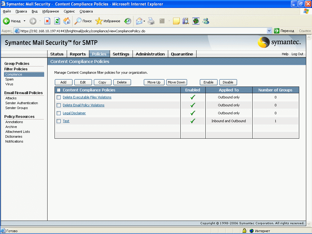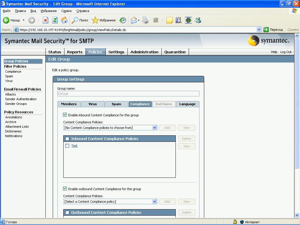 Рисунок 14: Policies – Group Policies – Compliance – Настройка правил контетной фильтрации для входящей и исходящей почты, набор правил можно определять самостоятельно (см. Рисунок 16-18)