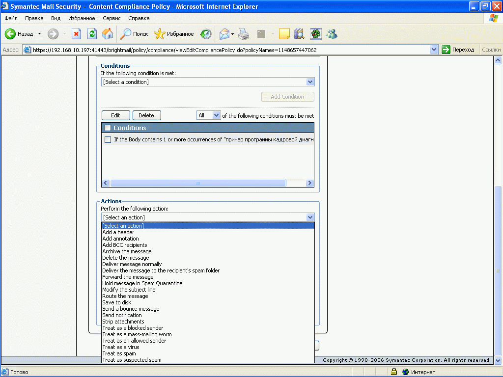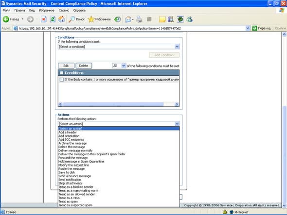 Рисунок 18: Policies – Filter Policies – Compliance – Actions – Варианты действий над сообщениями, удовлятворяющими критериям контетного фильтра