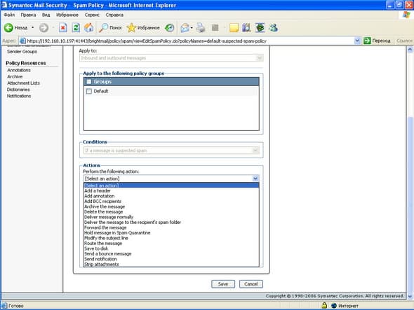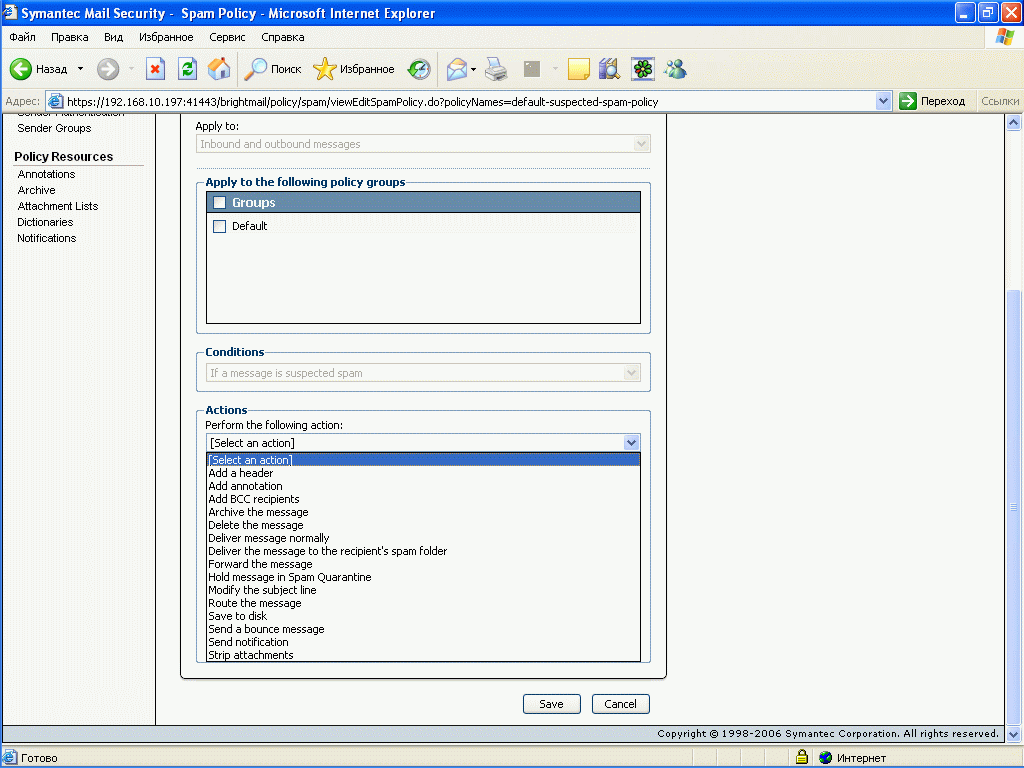 Рисунок 20: Policies – Filter Policies – Spam – Actions – Варианты действий над сообщениями, удовлятворяющими критериям спам фильтра (Варианты: Spam и Suspected Spam