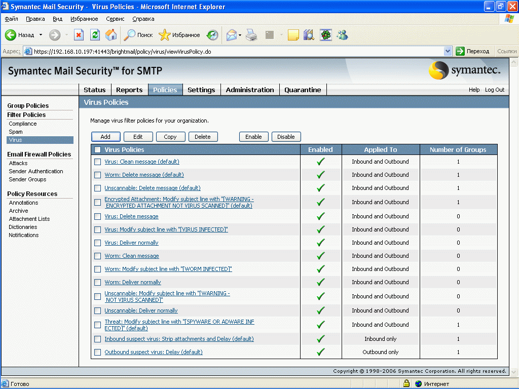 Рисунок 21: Policies – Filter Policies – Virus – Набор правил фильтрации вирусов, возможно создание, копирование, активизация правил, а также просмотр информации о количестве групповых политик, в которых данное правило используется