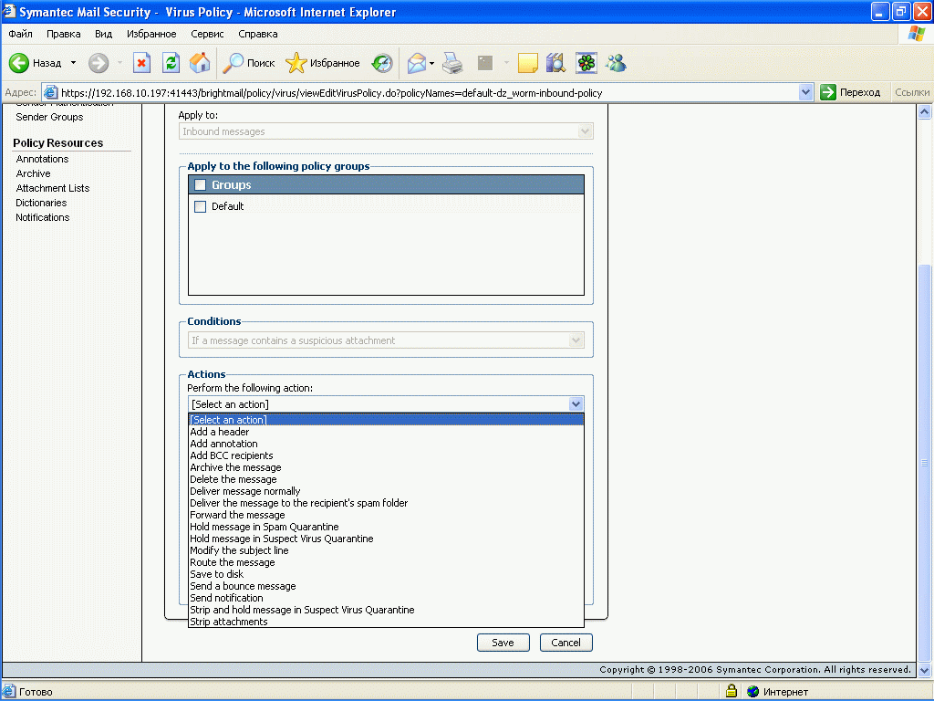 Рисунок 24c: Policies – Email Firewall Policies – Attacks – Virus Attack – Варианты действий над сообщениями и критерии Virus Attack