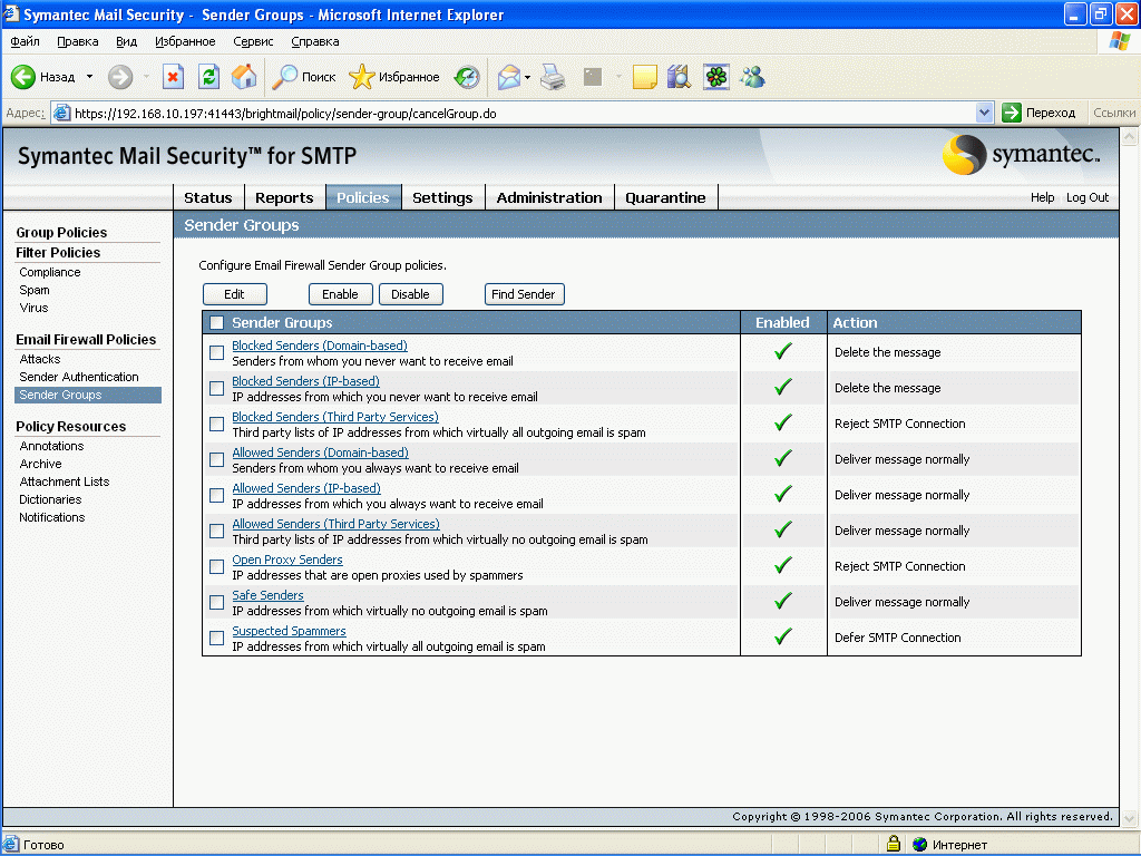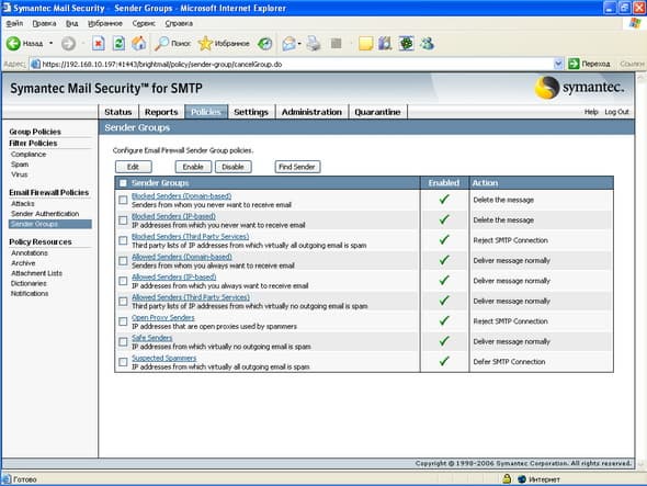 Рисунок 26: Policies – Email Firewall Policies – Sender Groups – Активизация и настройка девяти типов белых и черных списков IP адресов и доменов отправителей, в том числе три списка, регулярно обновляемых Symantec Security Response (Open Proxy Senders, Safe Senders, Suspected Spammers), два списка с возможностью подключения RBL сервисов сторонних производителей и четыре списка, доступных для редактирования администраторами системы (распространяются на всех пользователей) и индивидуально каждым пользователем через веб консоль или через Outlook Spam Plug-in при настройке соответствующих прав