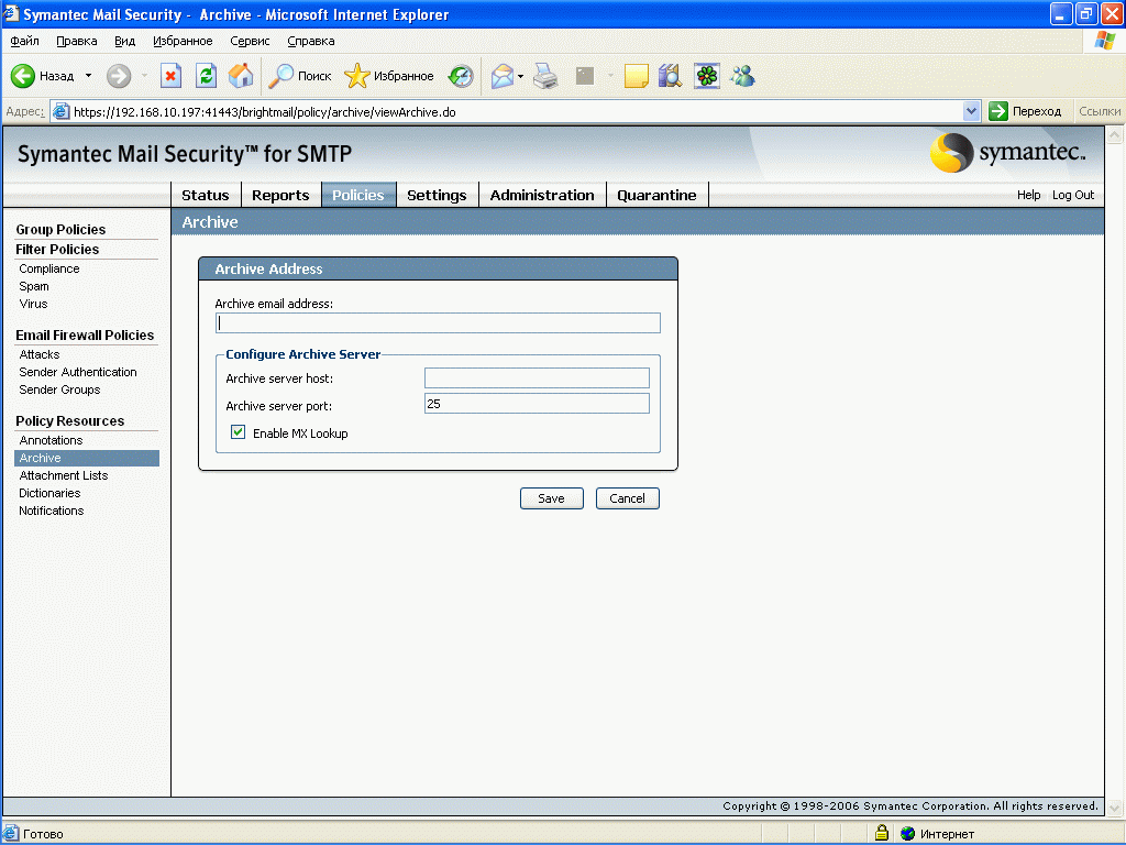 Рисунок 29: Policies – Policy Resources – Archive – Настройка возможности пересылки копии всего потока сообщений на удаленный ресурс