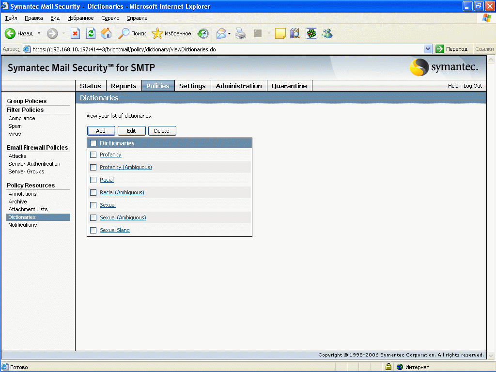 Рисунок 32: Policies – Policy Resources – Dictionaries – Создание и редактирование наборов слов, применяемых для определения правил контентной фильтрации