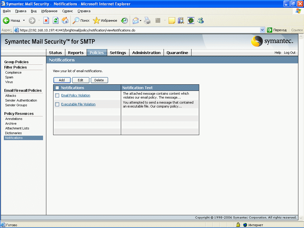 Рисунок 34: Policies – Policy Resources – Notifications – Пример создания информационного письма