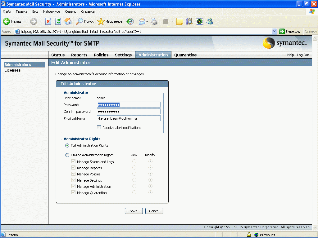 Рисунок 35: Administration – Administrators – Создание и редактирование учетных записей администраторов системы