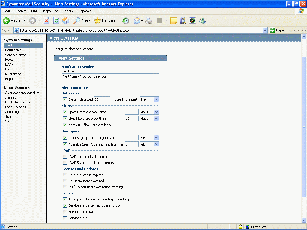 Рисунок 37: Settings – System Settings – Alerts – Настройка системы критических уведомлений системы