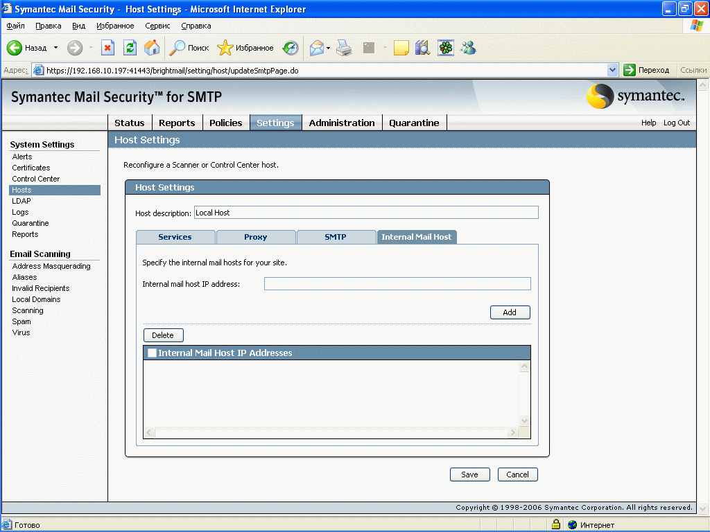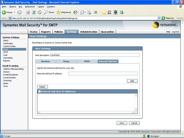 Рисунок 44: Settings – System Settings – Hosts – Internal Mail Hosts – Настройка списка внутренних почтовых хостов