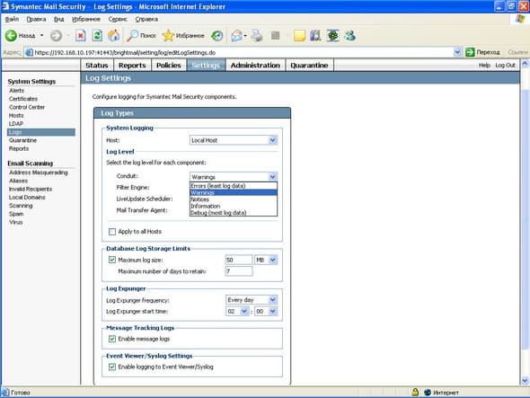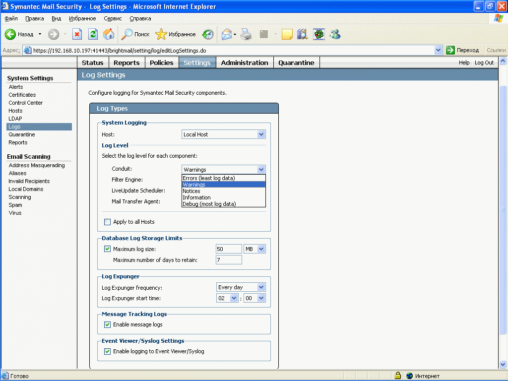 Рисунок 47: Settings – System Settings – Logs – Настройка системных логов: степень детализации, размер, график удаления и проч.