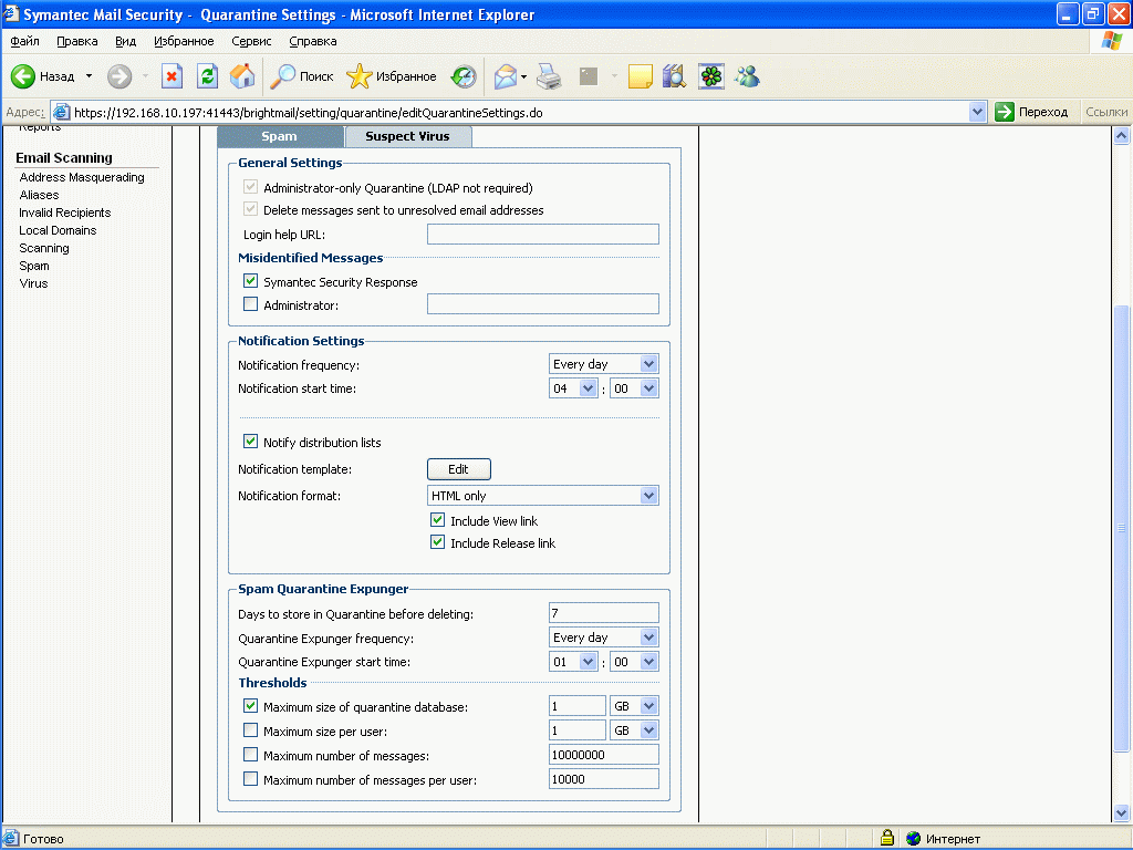 Рисунок 48c: Settings – System Settings – Quarantine – Spam – Настройка параметров спам карантина, при создании LDAP подключения (достачтоно аутентификации) возможно активировать карантин для конечных пользователей, также при включении настроек возможно удалять письма для несуществующих пользователей (в отличие от удаления на стадии сканера не требует сервера синхронизации LDAP)