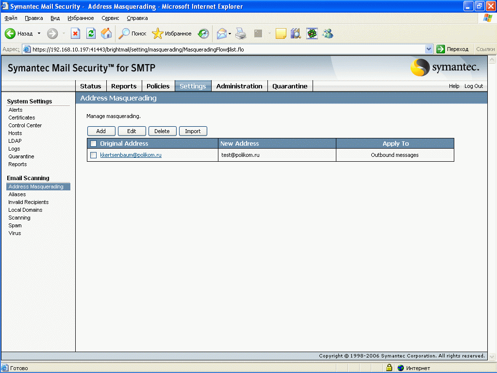 Рисунок 51: Settings – System Settings – Email Scanning – Address Masquerading – Настройка возможности маскировки адресов во входящих и исходящих сообщениях
