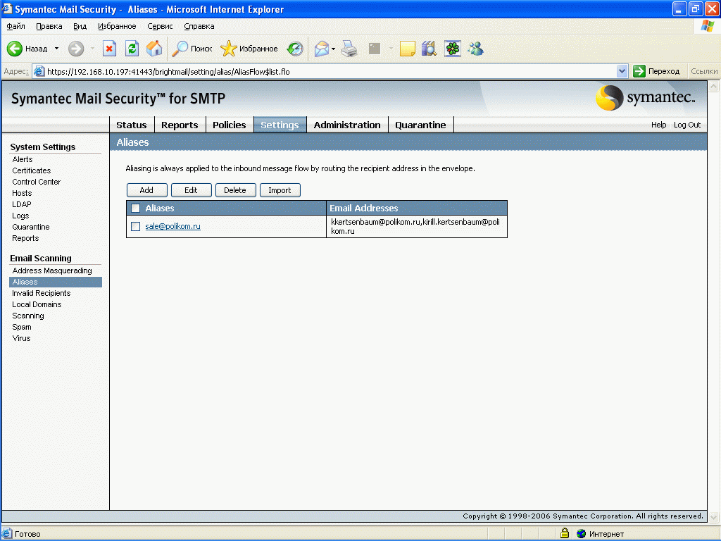 Рисунок 52: Settings – System Settings – Email Scanning – Aliases – Настройка почтовых групп для входящих сообщений