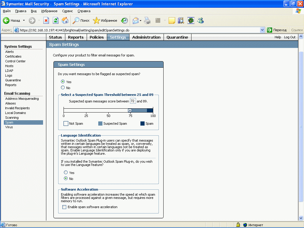 Рисунок 56: Settings – System Settings – Email Scanning – Spam – Настройка критериев идентификации спама