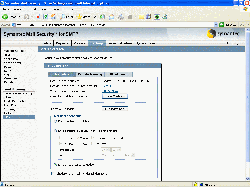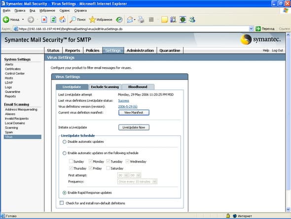 Рисунок 57a: Settings – System Settings – Email Scanning – Virus – LiveUpdate – Настройка обновлений антивирусных баз: обновление по расписанию, а также возможность включения режима обновления Rapid Response – новое обновление примерно каждые 10 минут