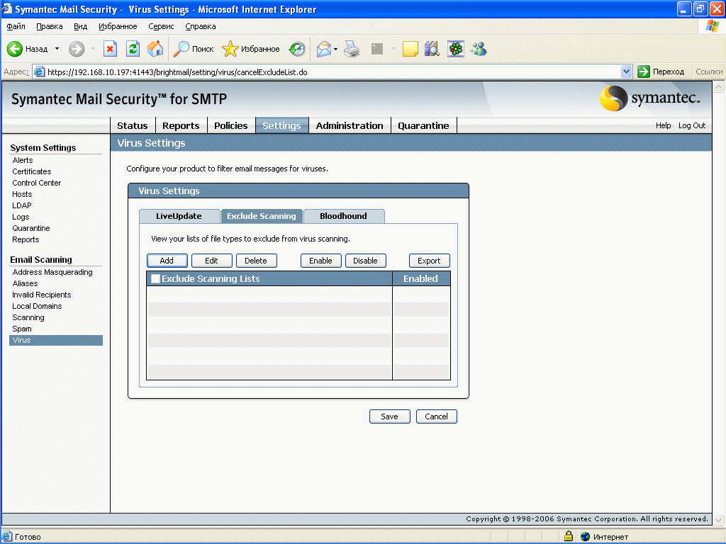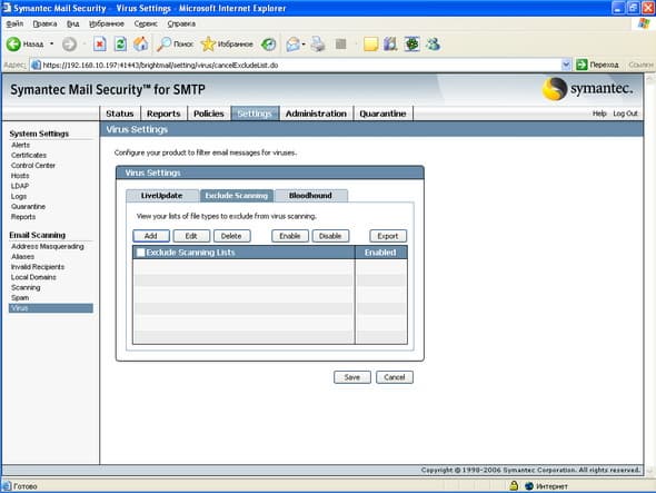 Рисунок 57b: Settings – System Settings – Email Scanning – Virus – Exclude Scanning – Создание, редактирование и активизация списков исключения для сканирования