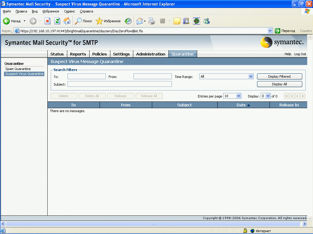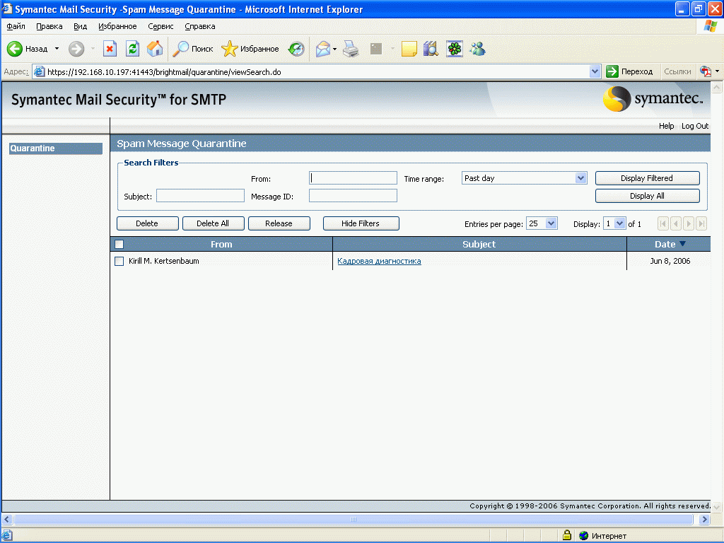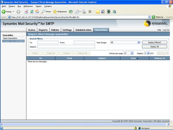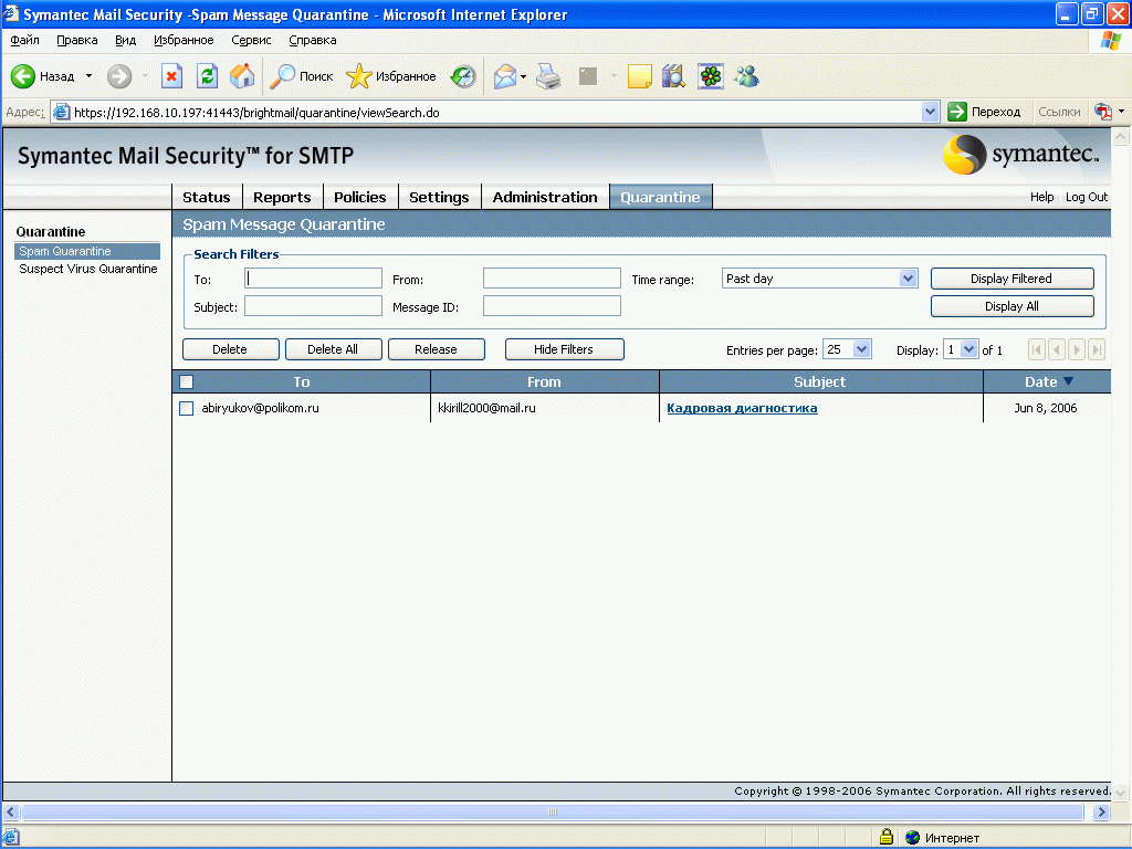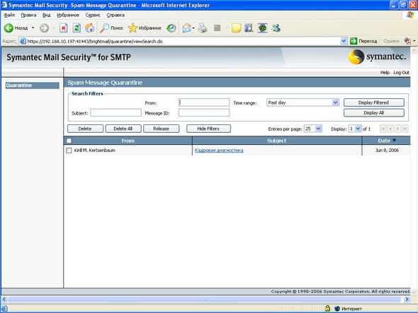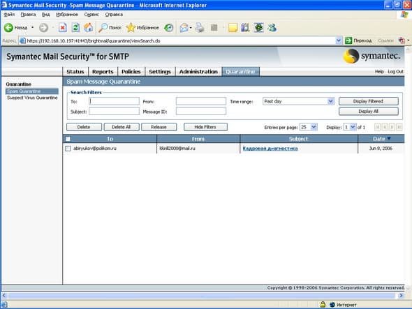 Рисунок 58: Quarantine – Spam Quarantine – Просмотр общего спам карантина с возможностью поиска и отбора