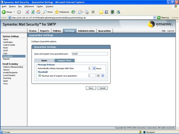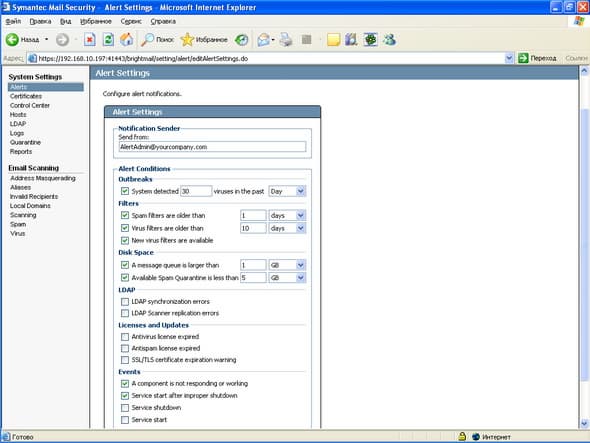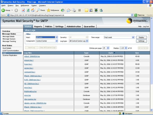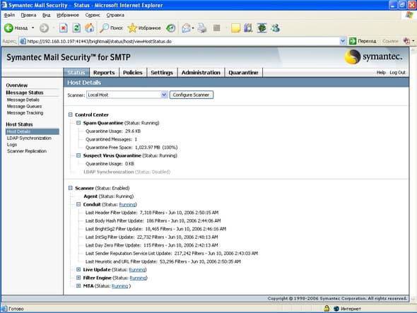 Установка проводилась на виртуальную машину с ОС Windows 2003 Server Standard с 512 Мб ОЗУ, сам процесс установки прост и интуитивно понятен. Продукт состоит из нескольких компонент, установка которых возможна на разные хосты (См. Рисунок 63): сканеры отдельно, Центр Управления вместе с карантином отдельно, соответственно неограниченное число сканеров может быть поключено к одному Центру Управления. Тестирование проводилось на сымитированном потоке писем, который отсылался с помощью почтового клиента на SMTP соединение виртуальной машины, поэтому говорить о качестве срабатывания по спаму сложно, с вирусами проблем не было, не было также проблем с образцами контентной фильтрации (в том числе русский язык) и языковой идентификацией.Графический материал:
