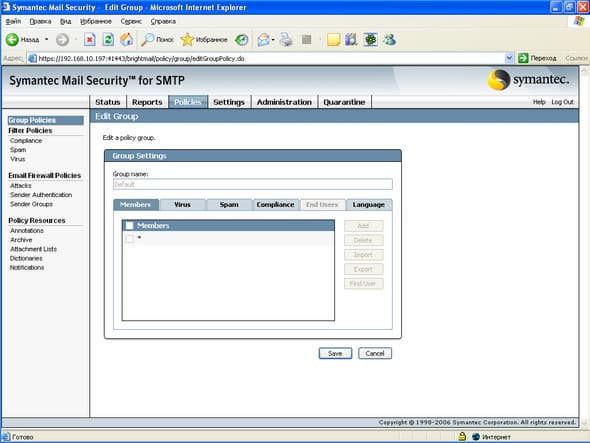 Рисунок 11: Policies – Group Policies – Members – Определение пользователей или групп пользователей для данной политики: возможен ручной ввод и загрузка из LDAP, настройка прав End Users доступна только при условии загрузки из LDAP, в этом случае возможно определение для пользователей прав на ведение собственных белых и черных списков, а также возможность изменения языковой идентификации на пользовательской веб консоли спам карантина