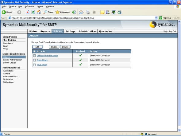 Рисунок 23: Policies – Email Firewall Policies – Attacks – Настройка и активизации трех типов защиты почтового сервера от атак: Directory Harvest Attack, Spam Attack и Virus Attack
