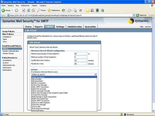 Рисунок 24a: Policies – Email Firewall Policies – Attacks – Directory Harvest Attack – Варианты действий над сообщениями и критерии Directory Harvest Attack