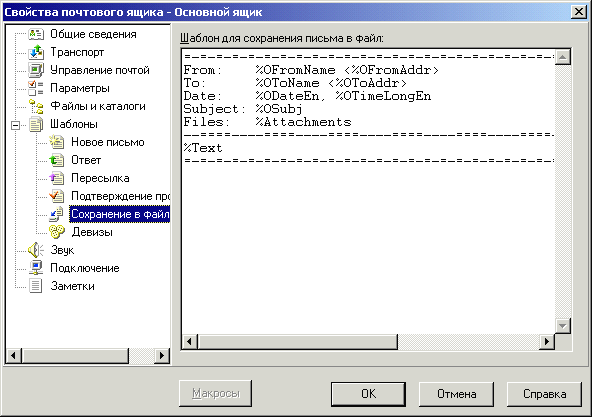 Шаблоны применяются по умолчанию для создания новых писем в пределах данного почтового ящика. Имется возможность назначения отдельных шаблонов для каждой папки, за исключением системных Inbox, Outbox, Sent и Trash. Кроме того, в шаблонах вы можете использовать макросы специальные команды, вместо которых будут подставляться соответствующие параметры, позволяющие делать шаблоны чрезвычайно интерактивными и развитыми.