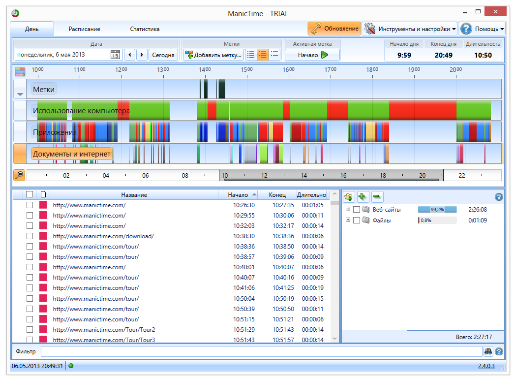 Статистика доступна в главном окне программы. Здесь можно ознакомиться с информацией о посещенных сайтах, открытых приложениях. Отличить проектные приложения от внепроектных легко по цвету временных отметок.