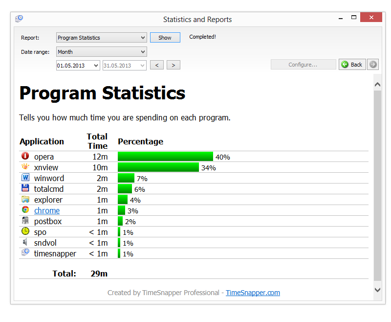 ManicTime — полнофункциональная программа для хронометража с возможностью построения графиков, сводных таблиц, сбора статистики по работе с приложениями и интернет-серфингу. Простой интерфейс делает ManicTime понятным и удобным инструментом для работы в однопользовательском режиме.