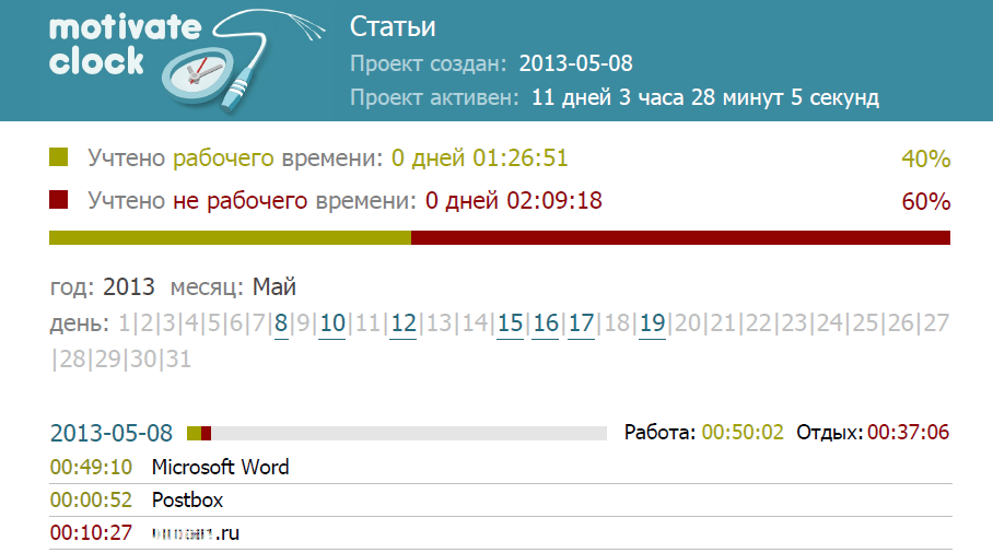 Одна из лучших user-friendly («дружелюбных») программ для учета времени — бесплатная, функциональная, удобная в использовании и оснащенная лаконичной документацией. В Motivate Clock заложен коммерческий потенциал, и если не в бесплатной, то хотя бы в платной версии продукта хотелось бы видеть больше возможностей, касающихся статистики, а так же онлайн-синхронизацию. К сожалению, около года программа не обновлялась.