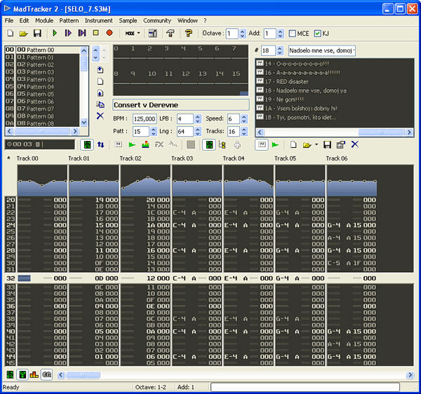 В каждой позиции дорожки может быть записана либо нота, либо управляющая команда. Нот, как известно, всего семь, которые в сочетании с пятью диезами/бемолями, дают октаву, состоящую из двенадцати полутонов. Все давно придумано, ничего нового и оригинального в трекерных редакторах ожидать, разумеется, не стоит.
