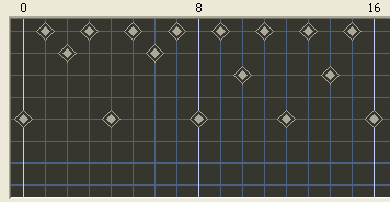 Ударные инструменты набираются в отдельных кадрах Drum Patterns с очень простым, наглядным интерфейсом. По умолчанию каждый такт имеет 8 долей. Вы можете использовать 8 инструментов в партии. Получается некое подобие шахматных досок. Левая кнопка мыши назначает событие, средняя – удаляет.![]()