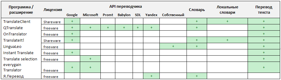 Таблица 1. Сравнение функциональности контекстных переводчиков