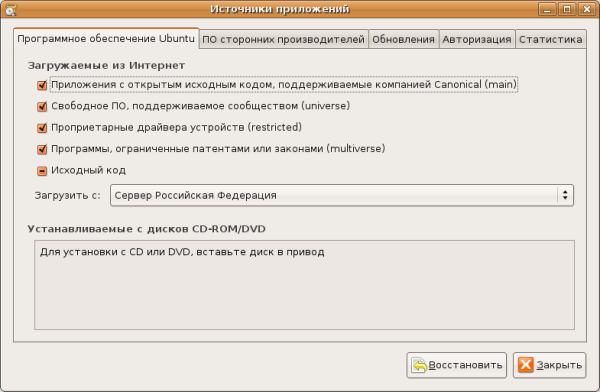 Ubuntu по умолчанию поддерживает работу с пятью репозиториями. Система позволяет подключать любые другие источники, однако это может негативно повлиять на стабильность системы - никто не тестировал сторонние приложения на совместимость, на отсутствие конфликтов с другими компонентами. Это осуществляется только в рамках нескольких репозиториев, список которых и предлагает Synaptic. Первый источник включает в себя свободное программное обеспечение, поддерживаемое компанией - разработчиком дистрибутива. Второй источник - свободные программы, поддерживаемые сообществом. Далее идет закрытое ПО. Третий источник - драйвера, четвертый - приложения. Предлагается ищи один репозиторий, содержащих исходные тексты пакетов, однако он нужен только разработчикам. Для простых пользователей все программы заранее собраны и протестированы на совместимость.