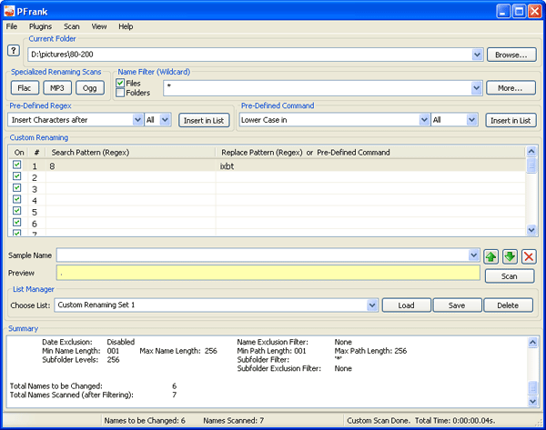 Для пакетного переименования файлов можно использовать PFrank. Название программы является сокращением фразы Peter's Flexible RenAmiNg Kit, что в переводе на русский язык означает «Гибкий Набор Петра Для Переименований». Программа имеет несколько вариантов заранее подготовленных алгоритмов изменения имен. Они включают в себя смену регистра, вставку символов, добавление к имени названия родительской папки, удаление лишних пробелов. Кроме того, имеется возможность вставки некоторых атрибутов файла, добавления информации из ID3-тегов музыкальных файлов, вставки тегов EXIF, IPTC и других метаданных графических файлов. Вы можете также добавлять теги из RAW большого числа современных фотокамер, но эта поддержка осуществляется через подключаемый модуль. Вставка тегов также поддерживается для видео, различных документов с разметкой текста (HTML), для электронной почты (берется из базы), офисных документов. Имеется возможность добавления строк из текстовых файлов.