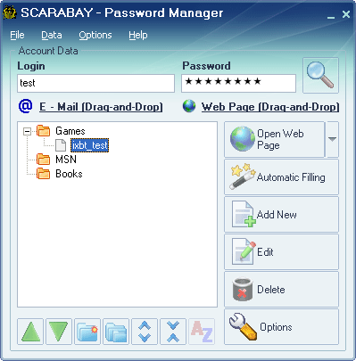Программа обладает некоторыми средствами автоматизации работы пользователя. Вы можете вводить имя и пароль одним щелчком мыши в браузеры Internet Explorer, Maxthon Browser, Avant Browser, NetCaptor и Netscape. На панели инструментов IE появляется дополнительная кнопка SCARABAY, которая отвечает за автоматическую вставку имени и пароля в форму на web-странице. Простым перетаскиванием мыши можно вставить в любые поля окон приложений пароль, имя, почтовый адрес, URL.