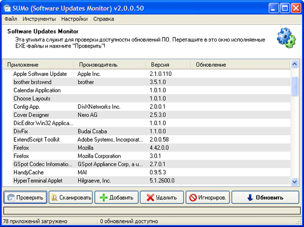 О функциональности приложения многое следует из назначения. SUMo позволяет автоматизировать процесс обновления приложений, установленных в системе. Сначала необходимо создавать список программы, которые необходимо отслеживать. Это можно делать вручную, но проще запустить сканирование системы. В этом случае в список добавляется все установленное программное обеспечение.