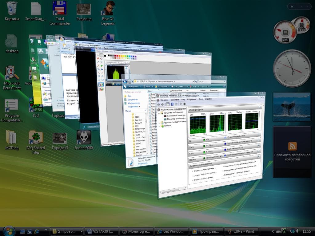 При первом взгляде на Windows Vista сразу привлекает внимание новый интерфейс и его трехмерная разновидность — «аэро» (в Home Basic, как уже упоминалось, отсутствует). Если видеоадаптер в вашем компьютере относительно новый, то есть модель (а не конкретный экземпляр) выпущена не больше двух-трех лет назад, то края окошек оказываются прозрачными. При наведении указателя мыши на кнопку панели задач всплывает экранчик, в реальном времени показывающий содержимое данного окна, даже если оно свернуто или закрыто другими окнами, а при нажатии клавиш Win+Tab окошки выстраиваются друг за дружкой, причем, опять же, каждое из них отображается в реальном времени, а не статичной картинкой.