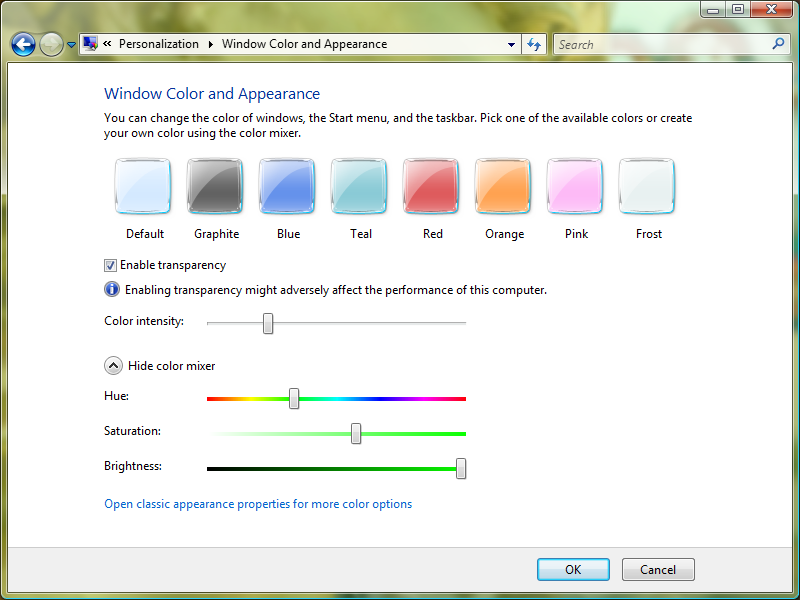 В Vista используется иной подход, при котором пользователь может задать цветовой тон обрамления окна, но элементы управления, такие как кнопки, линейки прокрутки и так далее, остаются неизменными в рамках выбранной темы.