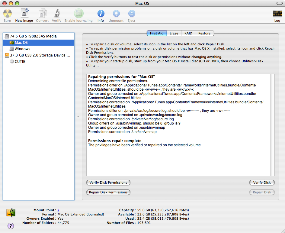 Интересной возможностью Mac OS X является так называемая проверка разрешений, verify disk permissions. Суть ее в том, что Disk Utility осуществляет сканирование диска и проверку разрешений файлов, находящихся в /System, /Library и /Applications, и — при необходимости, — исправление. Выполнение такой процедуры гарантирует, что никто не получит полномочий сверх необходимого.