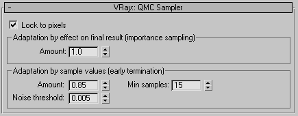 Lock to pixels используется для устранения миганий пикселов в анимации. Если установлена галочка в chekbox напротив этого параметра, при расчете изображения используется жесткая привязка значений рассчитываемых величин к пикселам изображения с тем, чтобы эти значения были одинаковы для одних и тех же пикселов разных соседних кадров. Метод Монте-Карло имеет случайную природу, поэтому и вычисляемые раз за разом с его помощью одни и те же величины могут немного отличаться друг от друга при прочих равных условиях. Если рассчитывается статичное изображение, этот параметр можно смело выключать. Lock to pixels и увеличение сэмплов для расчета величин - два основных метода борьбы с миганиями (flickering) в анимациях, рассчитываемых при помощи VRay.