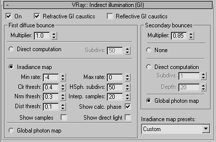 Расчет третьей компоненты освещения - отраженного диффузного освещения является одним из важнейших алгоритмов VRay и тоже достаточно независим от расчета других компонентов освещенности. Основные настройки расчета GI расположены на закладках VRay: Indirect Illumination, дополнительные - разбросаны фактически по всем закладкам VRay. Мы рассмотрим большинство из них - в свое время. Расчет GI можно произвольно включать и отключать при помощи check box "On" на закладке VRay: Indirect Illumination.