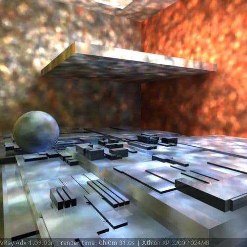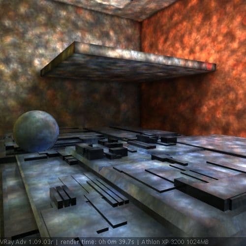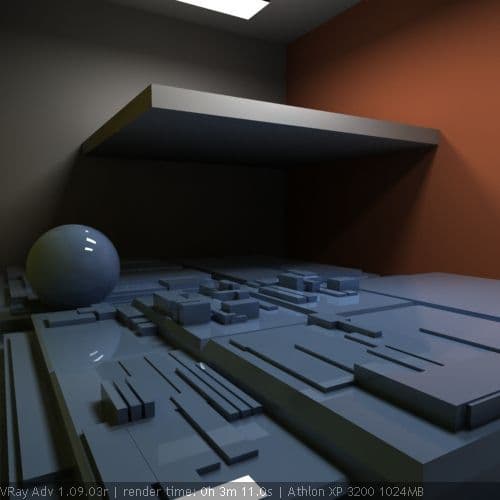 Метод расчета irradiance map выполняется гораздо быстрее direct computation и без потери качества изображения. Поэтому, он является основным для расчета первого диффузного отскока. Адаптивный расчет по выбираемым точкам - очень интересная находка VRay, являющаяся его существенным преимуществом. Так, расчет GI при помощи irradiance map + photon map в VRay аналогичен расчету GI в mental ray при помощи сочетания фотонных карт и final gathering. Однако, final gathering, в отличие от irradiance map, выбирает точки для расчета равномерно на основе заданного значения радиуса и без учета изменения цвета и геометрии. Поэтому, для получения сопоставимых по качеству с irradiance map результатов, final gathering должен использовать большее количество точек, а значит - выполняет расчеты медленнее.