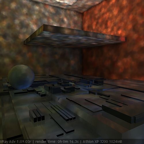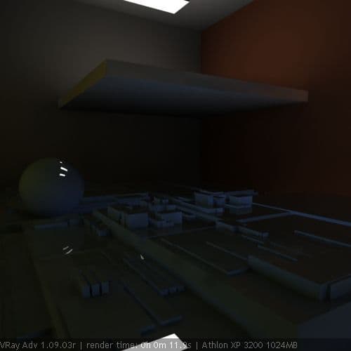 Собственно расчет освещенности точек выполняется аналогично direct computation - сэмплируется полусфера, находятся точки пересечения, рассчитывается прямая освещенность, если для вторичных отскоков используется тоже direct computation - строятся новые полусферы, если фотонные карты - происходит оценка освещенности по плотности фотонов. В общем - как обычно :). Но еще одна важная особенность расчета irradiance map и first diffuse bounce в целом - то, что на этапе вычислений первого диффузного отскока происходит подключение (читай - смешивания, сложения) как прямого освещения, так и освещения secondary bounces. Такова особенность VRay. Он не хранит все компоненты освещенности по отдельности, расчет первого отскока выполняется с учетом прямого освещения и остальных переотражений и результат записывается в файл. И если прямое освещение все же не хранится самой irradiance map, его можно отключать/включать, то многократные переотражения после расчета самостоятельного значения уже не имеют. То есть, если рассчитанная с учетом фотонной карты irradiance map сохранена в файле для дальнейшего использования, то загрузку фотонной карты из файла как и расчет secondary bounces можно отключать и это никак не скажется на конечном результате. Другой пример. Рассчитаем irradiance map без secondary bounces и сохраним в файл. Рассчитаем фотонную карту и тоже запишем в файл. Если теперь при рендере для first diffuse bounce использовать irradiance map из файла, а для secondary bounces - записанную фотонную карту и посчитать освещение, то сложения освещенностей не произойдет. Мы увидим только irradiance map и прямое освещение. Эта особенность расчетов GI в VRay имеет и положительные стороны - размер irradiance map гораздо меньше размера фотонной карты. А вышеописанная особенность позволяет нам использовать только irradiance map для дальнейших расчетов, если она предварительно рассчитана с учетом фотонной карты, и забыть о многомегабайтной фотонной карте.