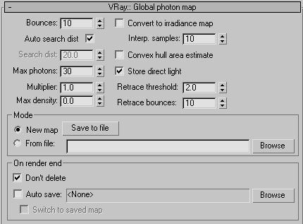 - Параметры Search dist. и Max. photons можно менять без пересчета фотонной карты. Это позволяет посчитать фотонную карту с требуемой плотностью один раз, сохранить ее в файл, потом менять эти параметры и выполнять рендер с загрузкой фотонной карты из файла. Очень удобно для настройки фотонной карты. Почему это возможно - понятно, Search dist. и Max. photons всего лишь определяют количество фотонов для оценки освещенности и ничего не меняют в самой фотонной карте.