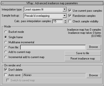Mode - различные режимы использования irradiance map. Bucket полезен при сетевом рендеринге, поскольку для каждого bucket создается своя irradiance map. Требует дополнительных расчетов (времени) для границ bucket, один из способов ускорить расчет - увеличивать размер bucket. Single frame - карта рассчитывается гораздо быстрее и сразу для всего изображения, но только при помощи одного компьютера. Остальные режимы предназначены для повторного использования рассчитанной irradiance map при изменении положения камеры (Incremental add to current map) или даже для анимации (Multiframe incremental) - карта будет считаться не целиком, а досчитывать только недостающие точки.